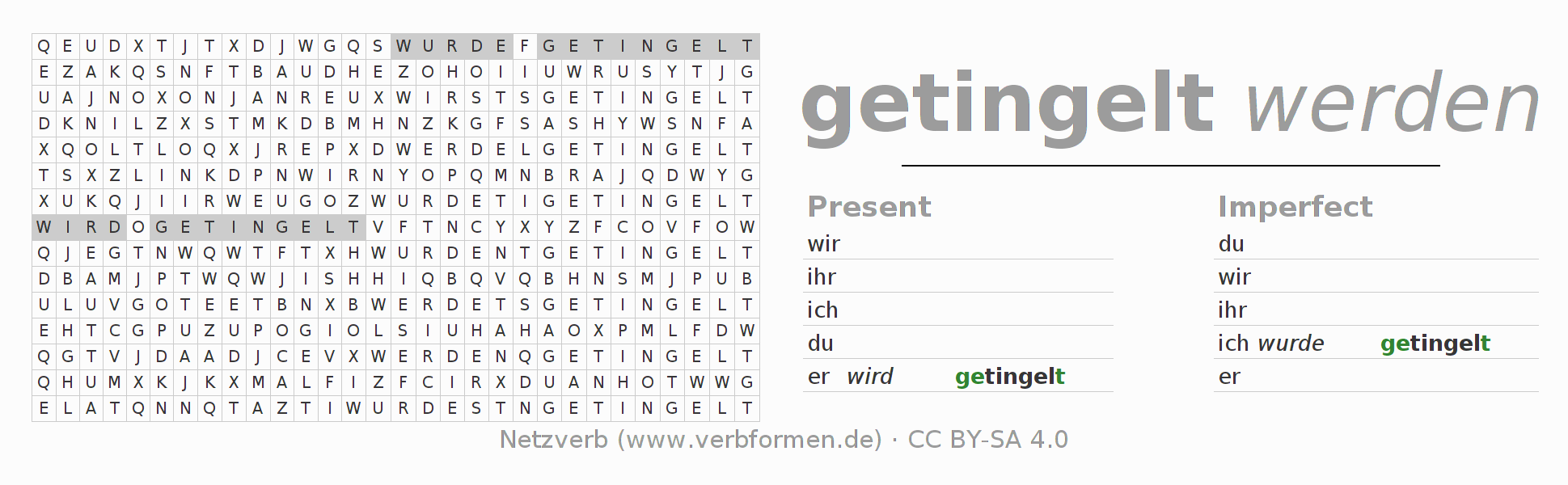 Worksheets are used generally for the conjugation of the verb tingeln in teaching. The materials can be used as Open Educational Resources (OER) for exercises, for games and as Tasks (CC BY-SA 4.0). There are many different types of tasks available for the verb tingeln (ist). These are overview sheets with complete conjugation, puzzles and games that require joint learning. The entire educational material is available for free as a PDF download, as pictures and as an interactive browser version. In addition to the tasks, countless examples for tingeln also provide an aid to using the verb.