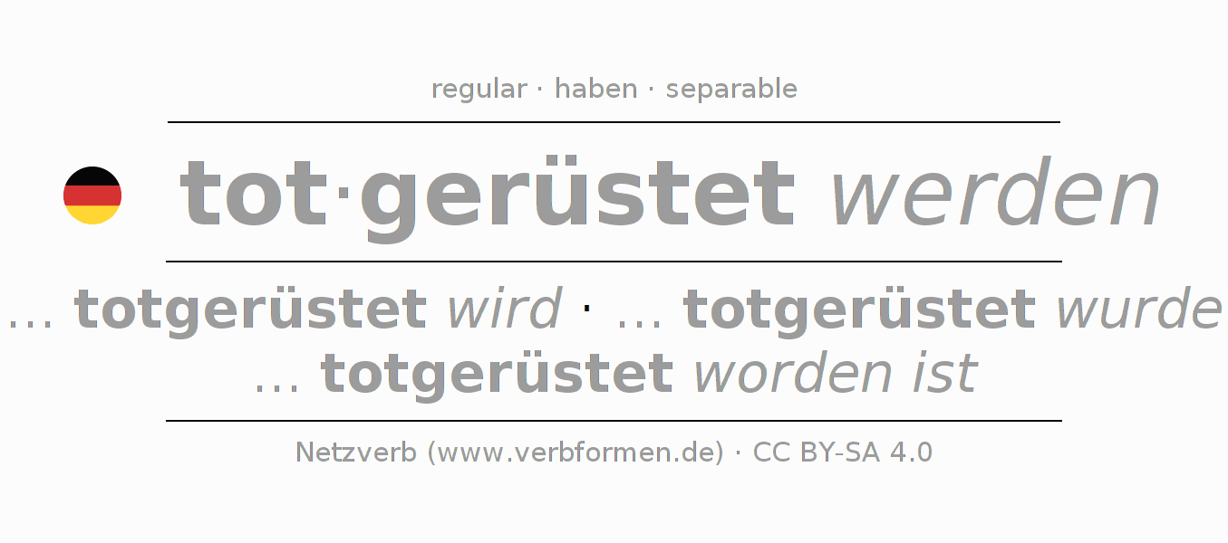Worksheets are used generally for the conjugation of the verb totrüsten in teaching. The materials can be used as Open Educational Resources (OER) for exercises, for games and as Tasks (CC BY-SA 4.0). There are many different types of tasks available for the verb totrüsten. These are overview sheets with complete conjugation, puzzles and games that require joint learning. The entire educational material is available for free as a PDF download, as pictures and as an interactive browser version. In addition to the tasks, countless examples for totrüsten also provide an aid to using the verb.