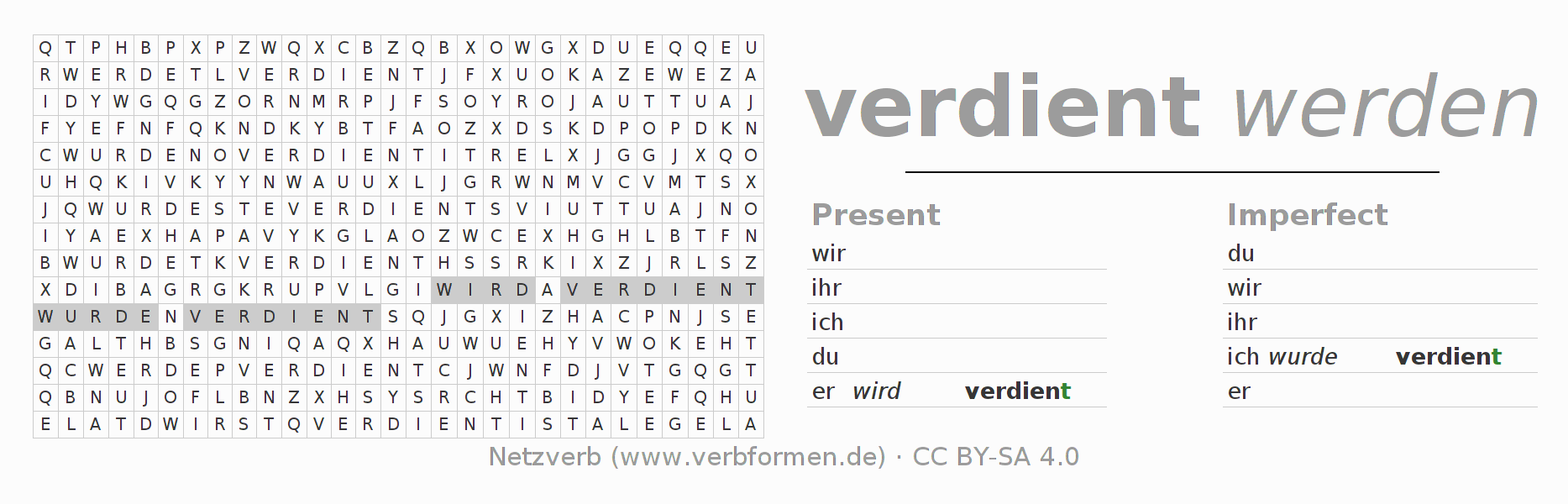 With these search word puzzles you can learn the conjugation of the German verb verdienen.