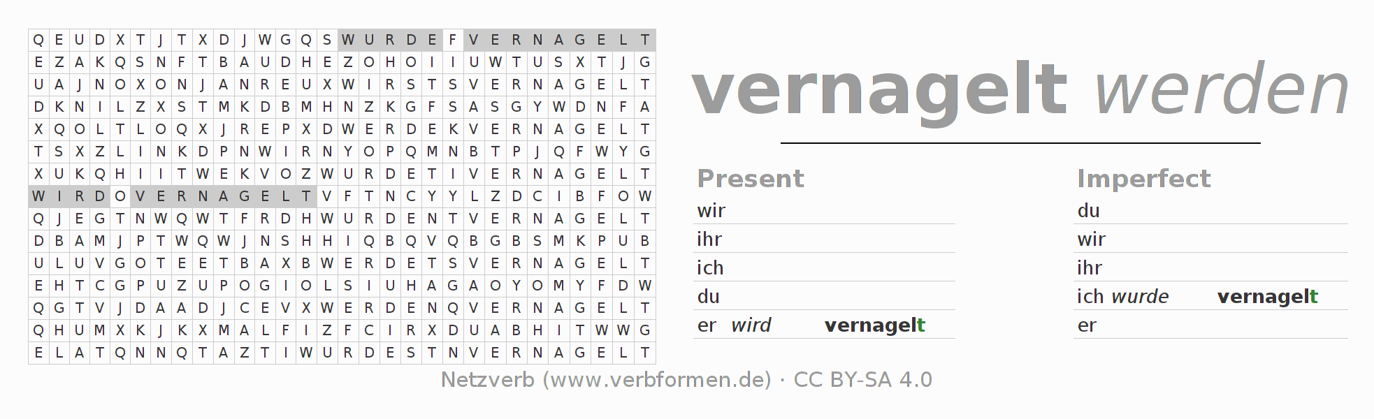 Worksheets are used generally for the conjugation of the verb vernageln in teaching. The materials can be used as Open Educational Resources (OER) for exercises, for games and as Tasks (CC BY-SA 4.0). There are many different types of tasks available for the verb vernageln. These are overview sheets with complete conjugation, puzzles and games that require joint learning. The entire educational material is available for free as a PDF download, as pictures and as an interactive browser version. In addition to the tasks, countless examples for vernageln also provide an aid to using the verb.