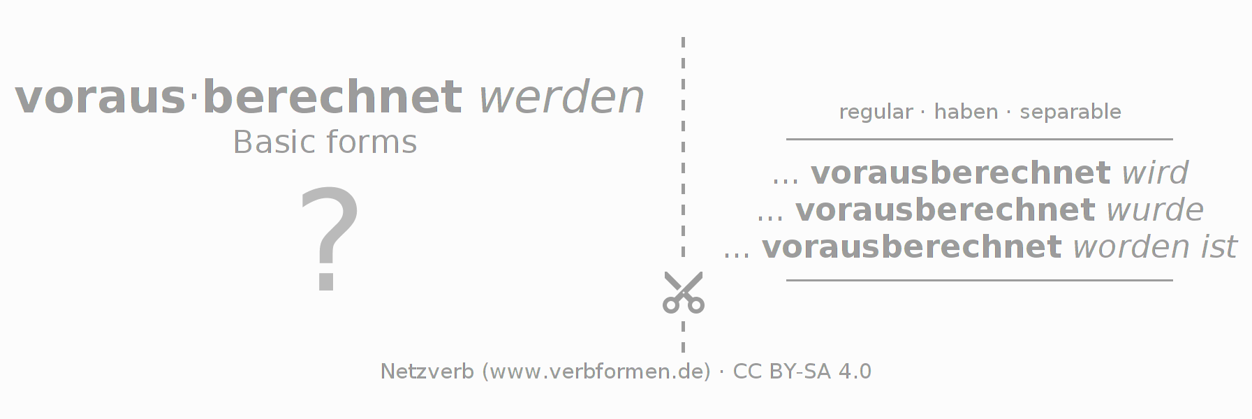 Worksheets are used generally for the conjugation of the verb vorausberechnen in teaching. The materials can be used as Open Educational Resources (OER) for exercises, for games and as Tasks (CC BY-SA 4.0). There are many different types of tasks available for the verb vorausberechnen. These are overview sheets with complete conjugation, puzzles and games that require joint learning. The entire educational material is available for free as a PDF download, as pictures and as an interactive browser version. In addition to the tasks, countless examples for vorausberechnen also provide an aid to using the verb.