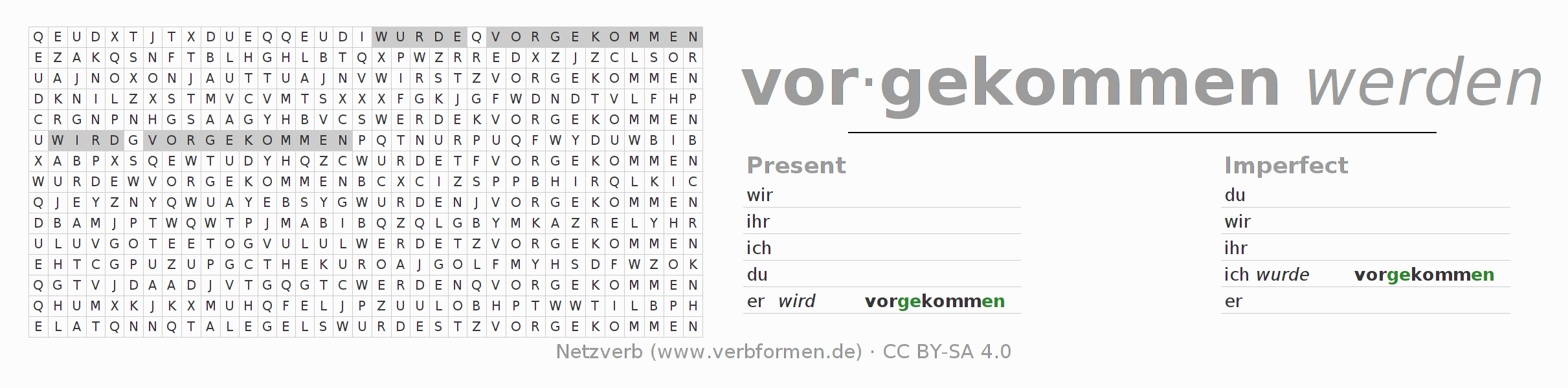 With these search word puzzles you can learn the conjugation of the German verb vorkommen.