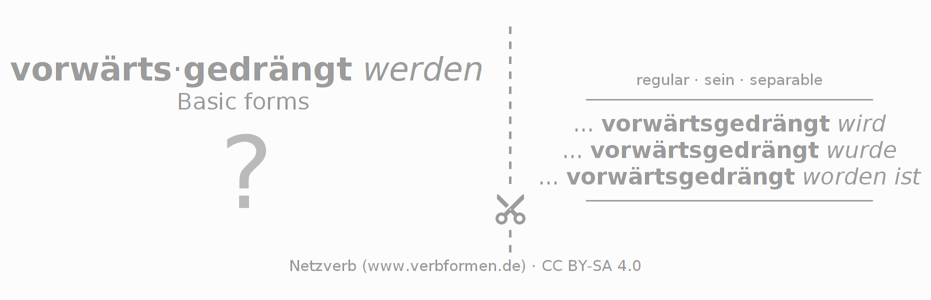 Worksheets are used generally for the conjugation of the verb vorwärtsdrängen in teaching. The materials can be used as Open Educational Resources (OER) for exercises, for games and as Tasks (CC BY-SA 4.0). There are many different types of tasks available for the verb vorwärtsdrängen. These are overview sheets with complete conjugation, puzzles and games that require joint learning. The entire educational material is available for free as a PDF download, as pictures and as an interactive browser version. In addition to the tasks, countless examples for vorwärtsdrängen also provide an aid to using the verb.