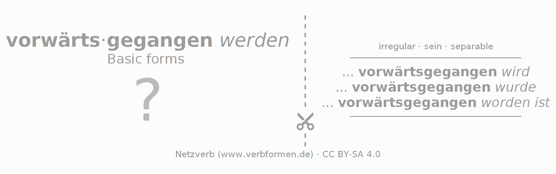 Worksheets are used generally for the conjugation of the verb vorwärtsgehen in teaching. The materials can be used as Open Educational Resources (OER) for exercises, for games and as Tasks (CC BY-SA 4.0). There are many different types of tasks available for the verb vorwärtsgehen. These are overview sheets with complete conjugation, puzzles and games that require joint learning. The entire educational material is available for free as a PDF download, as pictures and as an interactive browser version. In addition to the tasks, countless examples for vorwärtsgehen also provide an aid to using the verb.