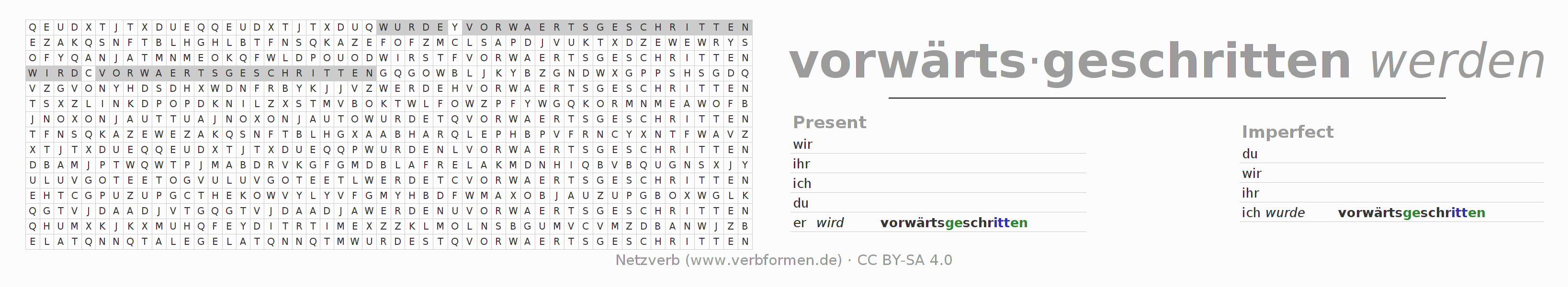 With these search word puzzles you can learn the conjugation of the German verb vorwärtsschreiten.