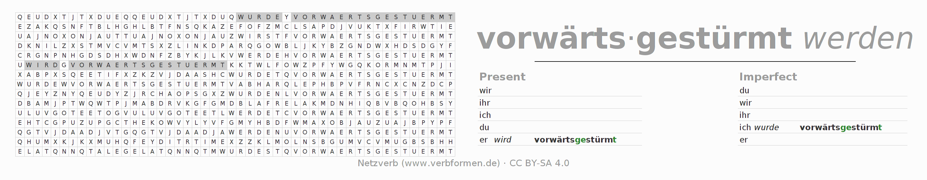With these search word puzzles you can learn the conjugation of the German verb vorwärtsstürmen.