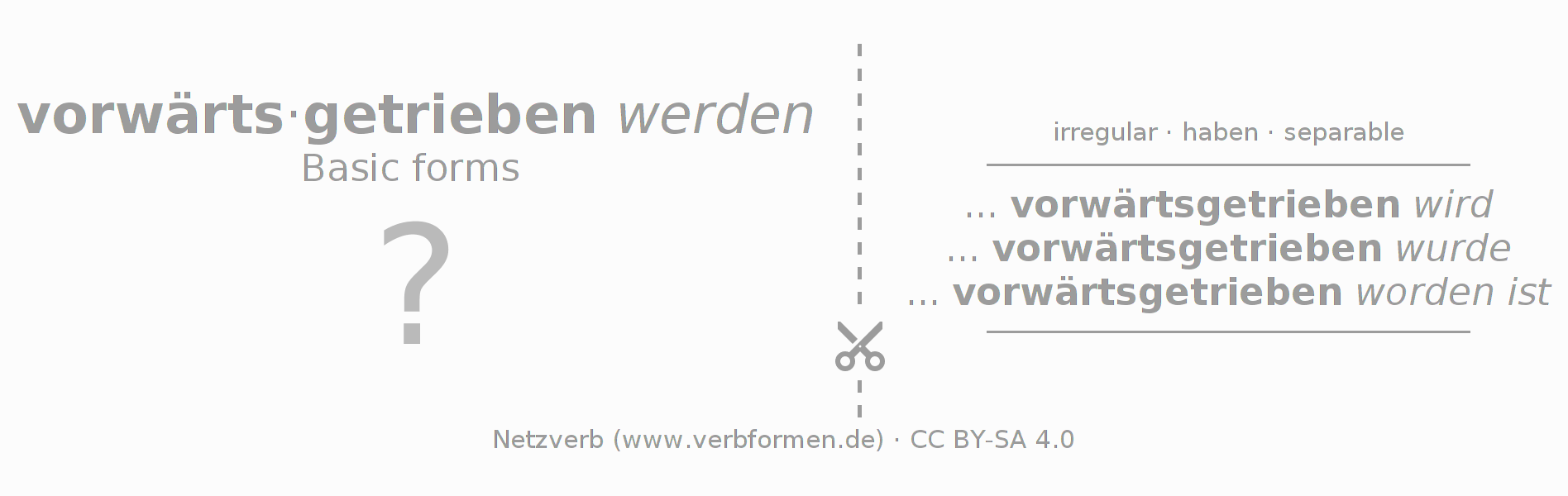 Worksheets are used generally for the conjugation of the verb vorwärtstreiben in teaching. The materials can be used as Open Educational Resources (OER) for exercises, for games and as Tasks (CC BY-SA 4.0). There are many different types of tasks available for the verb vorwärtstreiben. These are overview sheets with complete conjugation, puzzles and games that require joint learning. The entire educational material is available for free as a PDF download, as pictures and as an interactive browser version. In addition to the tasks, countless examples for vorwärtstreiben also provide an aid to using the verb.