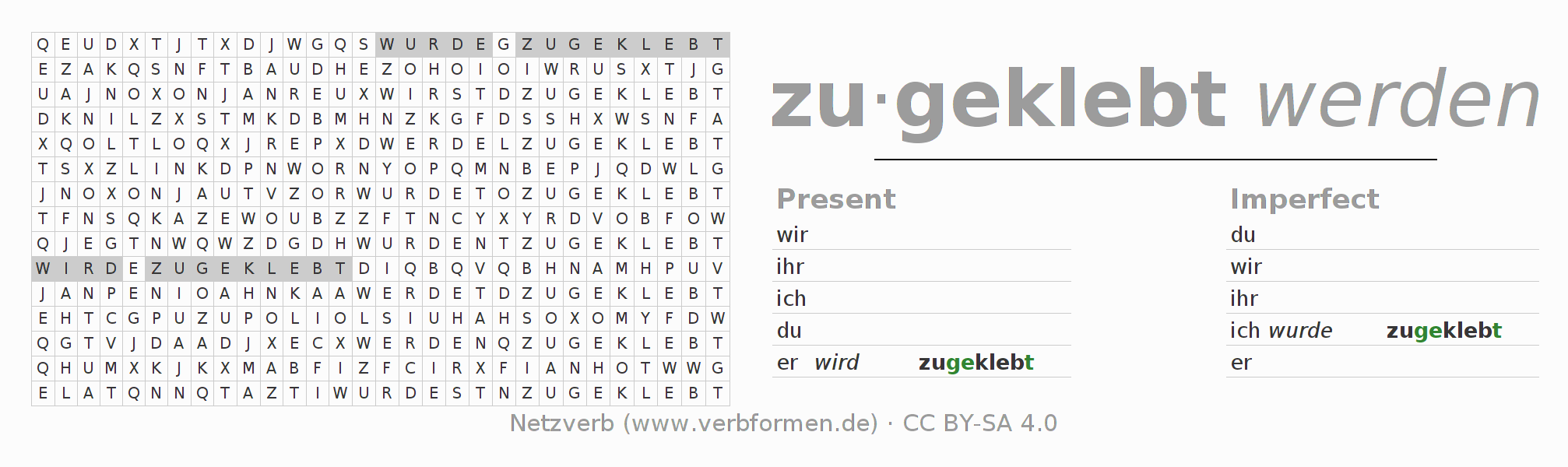 With these search word puzzles you can learn the conjugation of the German verb zukleben.