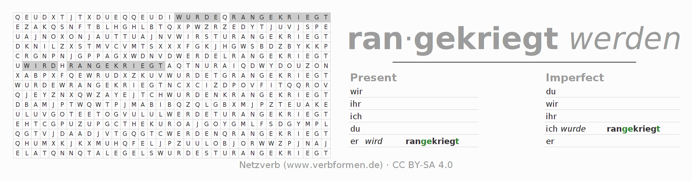 With these search word puzzles you can learn the conjugation of the German verb rankriegen.
