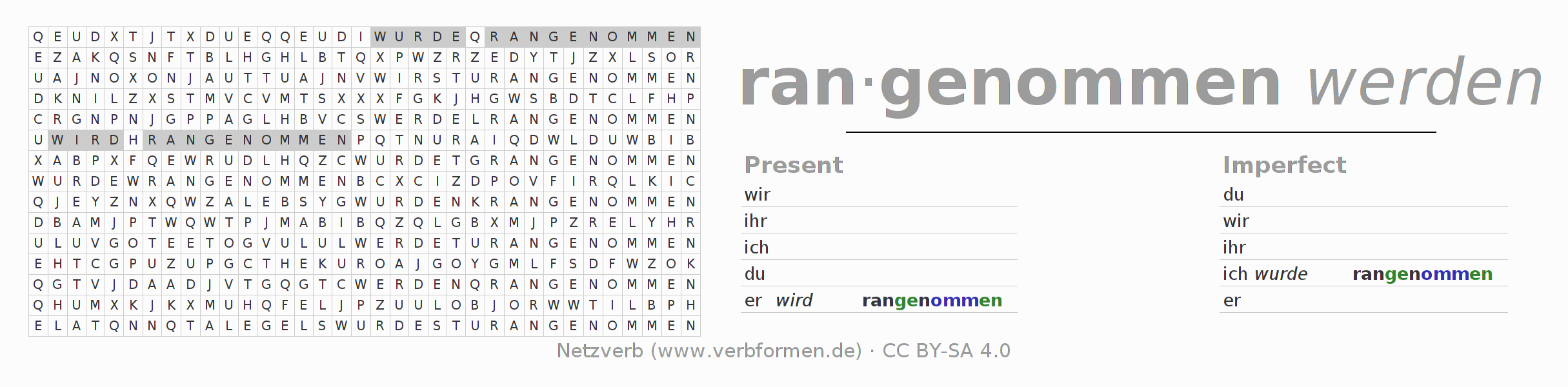 With these search word puzzles you can learn the conjugation of the German verb rannehmen.