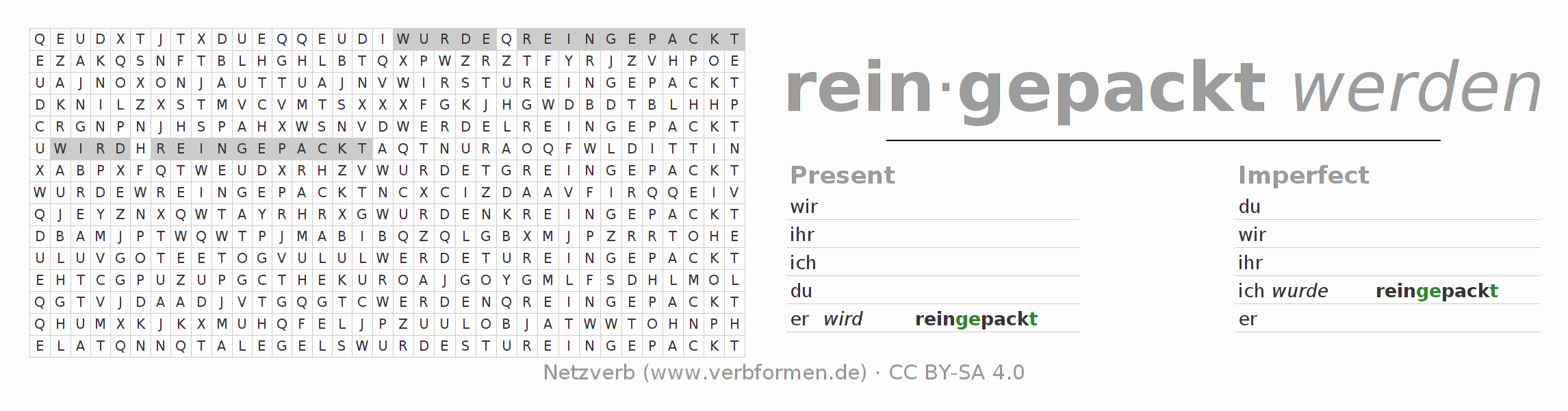 With these search word puzzles you can learn the conjugation of the German verb reinpacken.