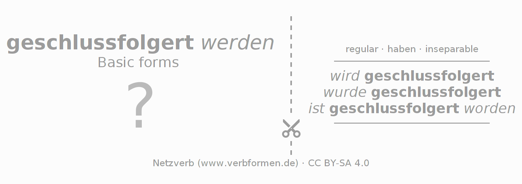 Worksheets are used generally for the conjugation of the verb schlussfolgern in teaching. The materials can be used as Open Educational Resources (OER) for exercises, for games and as Tasks (CC BY-SA 4.0). There are many different types of tasks available for the verb schlussfolgern. These are overview sheets with complete conjugation, puzzles and games that require joint learning. The entire educational material is available for free as a PDF download, as pictures and as an interactive browser version. In addition to the tasks, countless examples for schlussfolgern also provide an aid to using the verb.