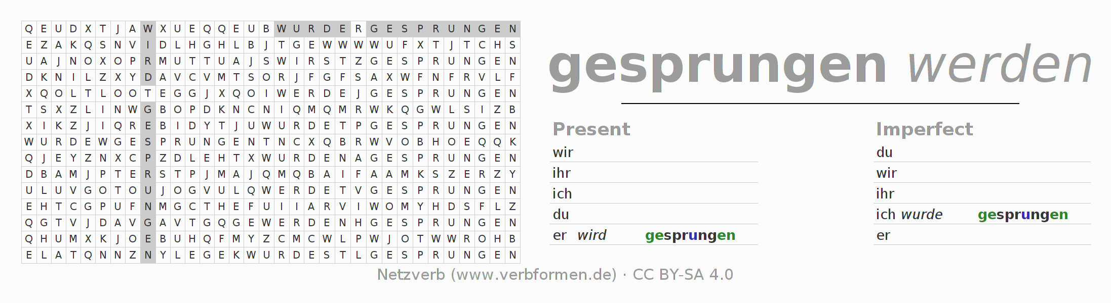 Worksheets are used generally for the conjugation of the verb springen in teaching. The materials can be used as Open Educational Resources (OER) for exercises, for games and as Tasks (CC BY-SA 4.0). There are many different types of tasks available for the verb springen (hat). These are overview sheets with complete conjugation, puzzles and games that require joint learning. The entire educational material is available for free as a PDF download, as pictures and as an interactive browser version. In addition to the tasks, countless examples for springen also provide an aid to using the verb.