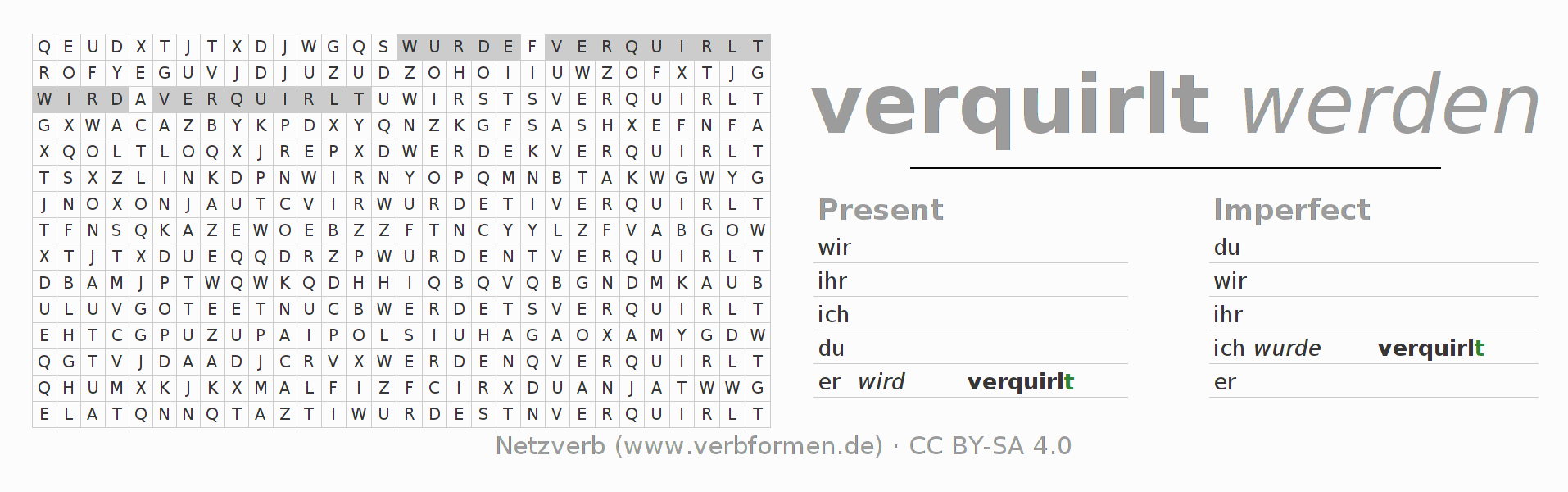 With these search word puzzles you can learn the conjugation of the German verb verquirlen.