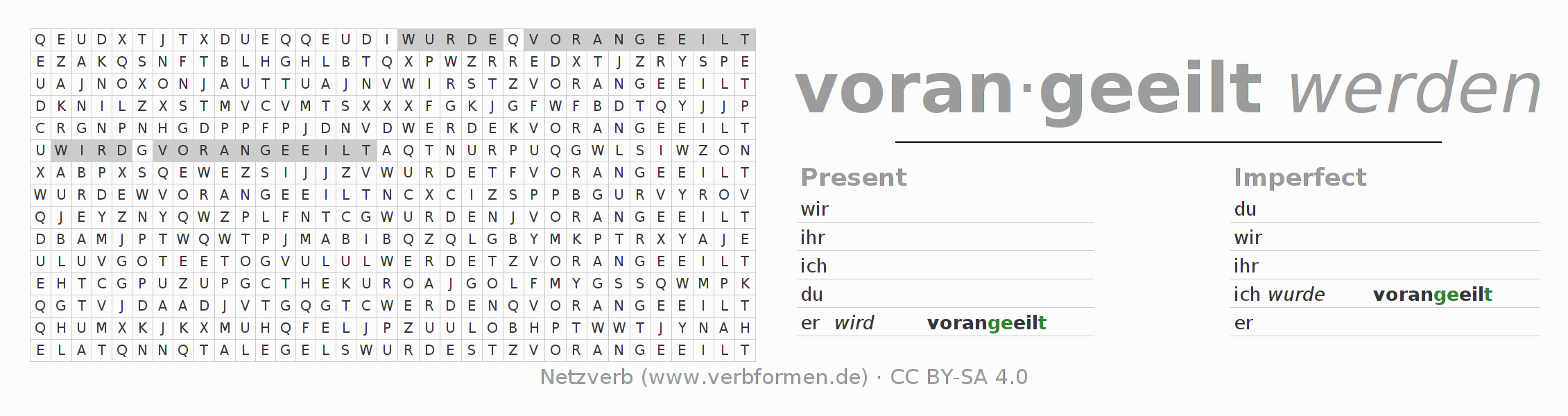 With these search word puzzles you can learn the conjugation of the German verb voraneilen.