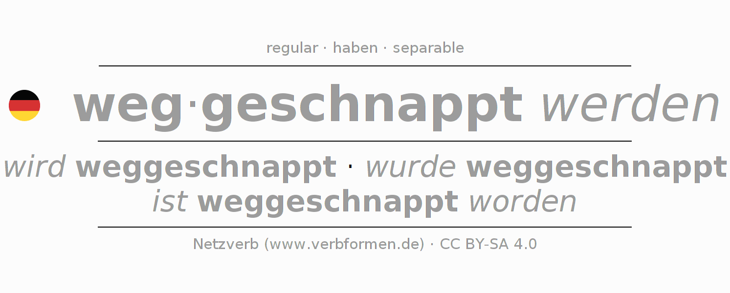 Worksheets are used generally for the conjugation of the verb wegschnappen in teaching. The materials can be used as Open Educational Resources (OER) for exercises, for games and as Tasks (CC BY-SA 4.0). There are many different types of tasks available for the verb wegschnappen. These are overview sheets with complete conjugation, puzzles and games that require joint learning. The entire educational material is available for free as a PDF download, as pictures and as an interactive browser version. In addition to the tasks, countless examples for wegschnappen also provide an aid to using the verb.