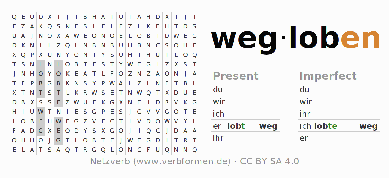 With these search word puzzles you can learn the conjugation of the German verb wegloben.