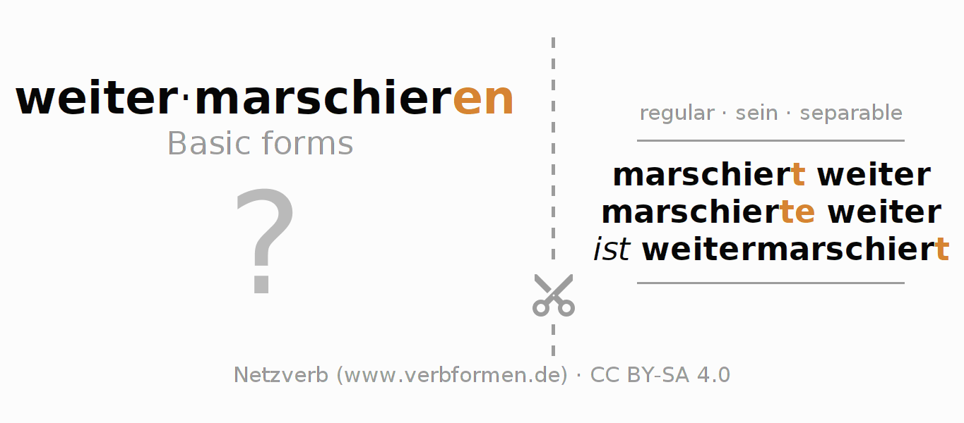 Worksheets are used generally for the conjugation of the verb weitermarschieren in teaching. The materials can be used as Open Educational Resources (OER) for exercises, for games and as Tasks (CC BY-SA 4.0). There are many different types of tasks available for the verb weitermarschieren. These are overview sheets with complete conjugation, puzzles and games that require joint learning. The entire educational material is available for free as a PDF download, as pictures and as an interactive browser version. In addition to the tasks, countless examples for weitermarschieren also provide an aid to using the verb.