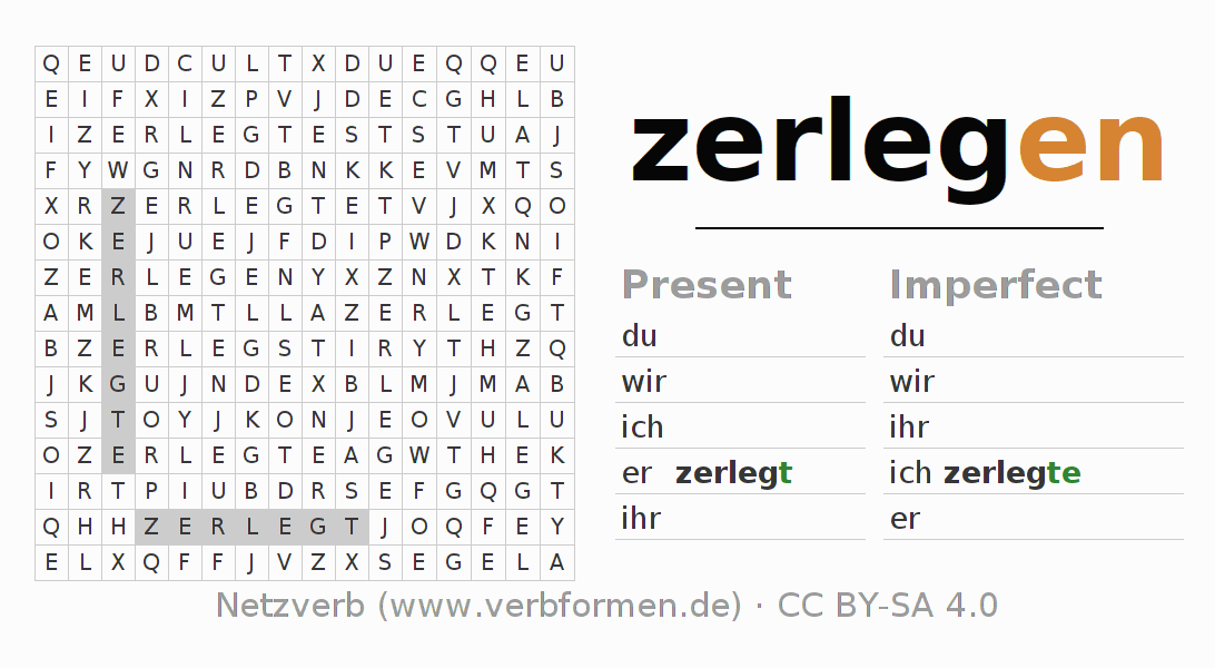 Worksheets are used generally for the conjugation of the verb zerlegen in teaching. The materials can be used as Open Educational Resources (OER) for exercises, for games and as Tasks (CC BY-SA 4.0). There are many different types of tasks available for the verb zerlegen. These are overview sheets with complete conjugation, puzzles and games that require joint learning. The entire educational material is available for free as a PDF download, as pictures and as an interactive browser version. In addition to the tasks, countless examples for zerlegen also provide an aid to using the verb.