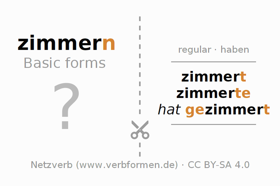 Worksheets are used generally for the conjugation of the verb zimmern in teaching. The materials can be used as Open Educational Resources (OER) for exercises, for games and as Tasks (CC BY-SA 4.0). There are many different types of tasks available for the verb zimmern. These are overview sheets with complete conjugation, puzzles and games that require joint learning. The entire educational material is available for free as a PDF download, as pictures and as an interactive browser version. In addition to the tasks, countless examples for zimmern also provide an aid to using the verb.