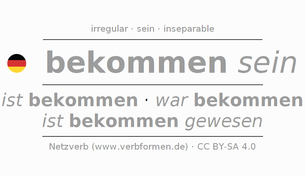Worksheets are used generally for the conjugation of the verb bekommen in teaching. The materials can be used as Open Educational Resources (OER) for exercises, for games and as Tasks (CC BY-SA 4.0). There are many different types of tasks available for the verb bekommen (ist). These are overview sheets with complete conjugation, puzzles and games that require joint learning. The entire educational material is available for free as a PDF download, as pictures and as an interactive browser version. In addition to the tasks, countless examples for bekommen also provide an aid to using the verb.