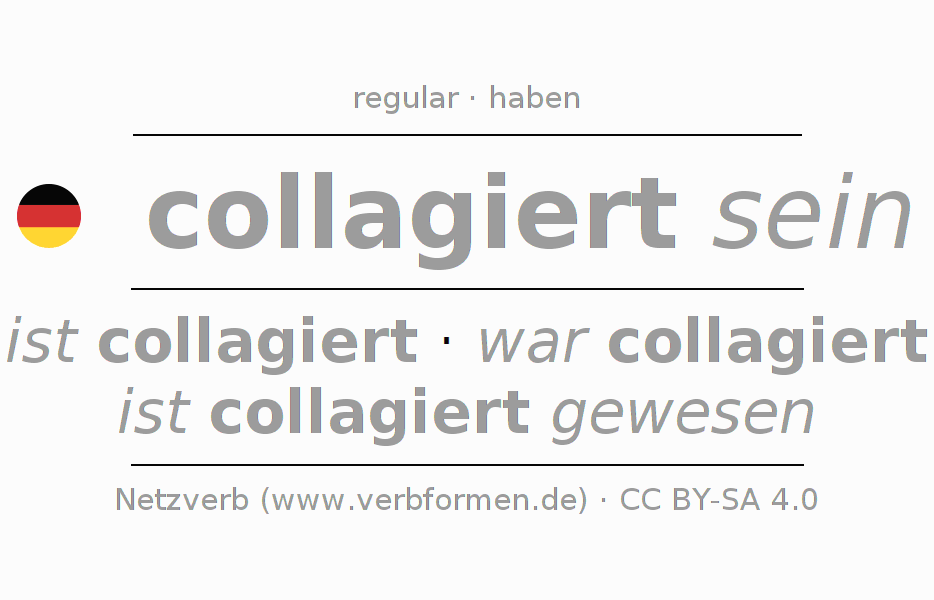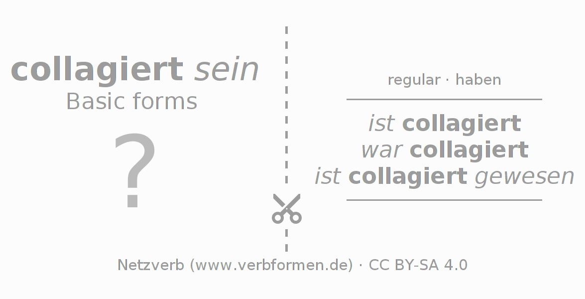 Worksheets are used generally for the conjugation of the verb collagieren in teaching. The materials can be used as Open Educational Resources (OER) for exercises, for games and as Tasks (CC BY-SA 4.0). There are many different types of tasks available for the verb collagieren. These are overview sheets with complete conjugation, puzzles and games that require joint learning. The entire educational material is available for free as a PDF download, as pictures and as an interactive browser version. In addition to the tasks, countless examples for collagieren also provide an aid to using the verb.