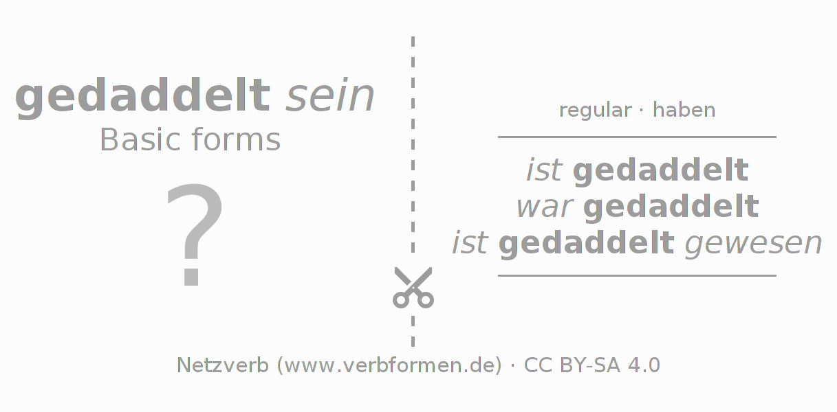 Worksheets are used generally for the conjugation of the verb daddeln in teaching. The materials can be used as Open Educational Resources (OER) for exercises, for games and as Tasks (CC BY-SA 4.0). There are many different types of tasks available for the verb daddeln. These are overview sheets with complete conjugation, puzzles and games that require joint learning. The entire educational material is available for free as a PDF download, as pictures and as an interactive browser version. In addition to the tasks, countless examples for daddeln also provide an aid to using the verb.