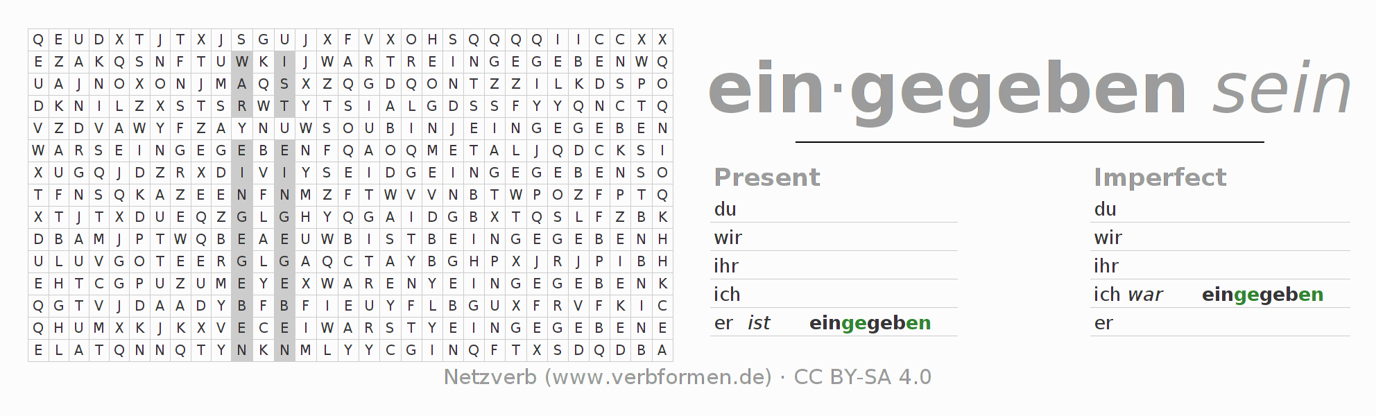Worksheets are used generally for the conjugation of the verb eingeben in teaching. The materials can be used as Open Educational Resources (OER) for exercises, for games and as Tasks (CC BY-SA 4.0). There are many different types of tasks available for the verb eingeben. These are overview sheets with complete conjugation, puzzles and games that require joint learning. The entire educational material is available for free as a PDF download, as pictures and as an interactive browser version. In addition to the tasks, countless examples for eingeben also provide an aid to using the verb.