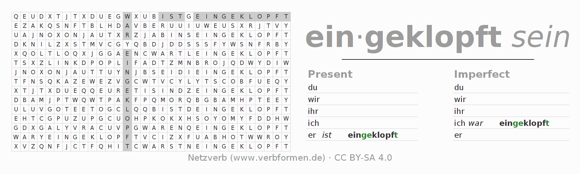 With these search word puzzles you can learn the conjugation of the German verb einklopfen.