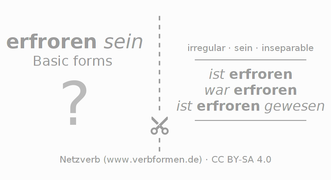 Worksheets are used generally for the conjugation of the verb erfrieren in teaching. The materials can be used as Open Educational Resources (OER) for exercises, for games and as Tasks (CC BY-SA 4.0). There are many different types of tasks available for the verb erfrieren (ist). These are overview sheets with complete conjugation, puzzles and games that require joint learning. The entire educational material is available for free as a PDF download, as pictures and as an interactive browser version. In addition to the tasks, countless examples for erfrieren also provide an aid to using the verb.