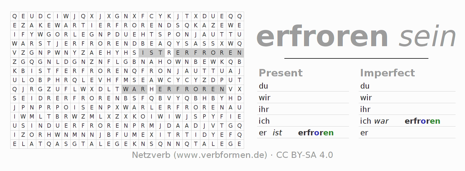 With these search word puzzles you can learn the conjugation of the German verb erfrieren.