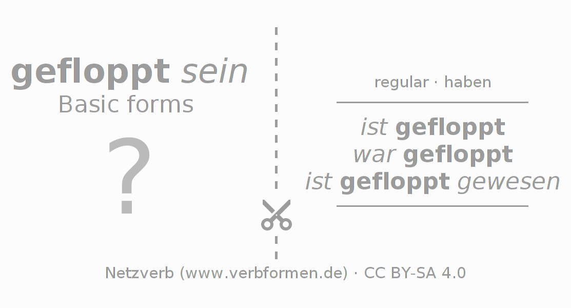Worksheets are used generally for the conjugation of the verb floppen in teaching. The materials can be used as Open Educational Resources (OER) for exercises, for games and as Tasks (CC BY-SA 4.0). There are many different types of tasks available for the verb floppen (hat). These are overview sheets with complete conjugation, puzzles and games that require joint learning. The entire educational material is available for free as a PDF download, as pictures and as an interactive browser version. In addition to the tasks, countless examples for floppen also provide an aid to using the verb.