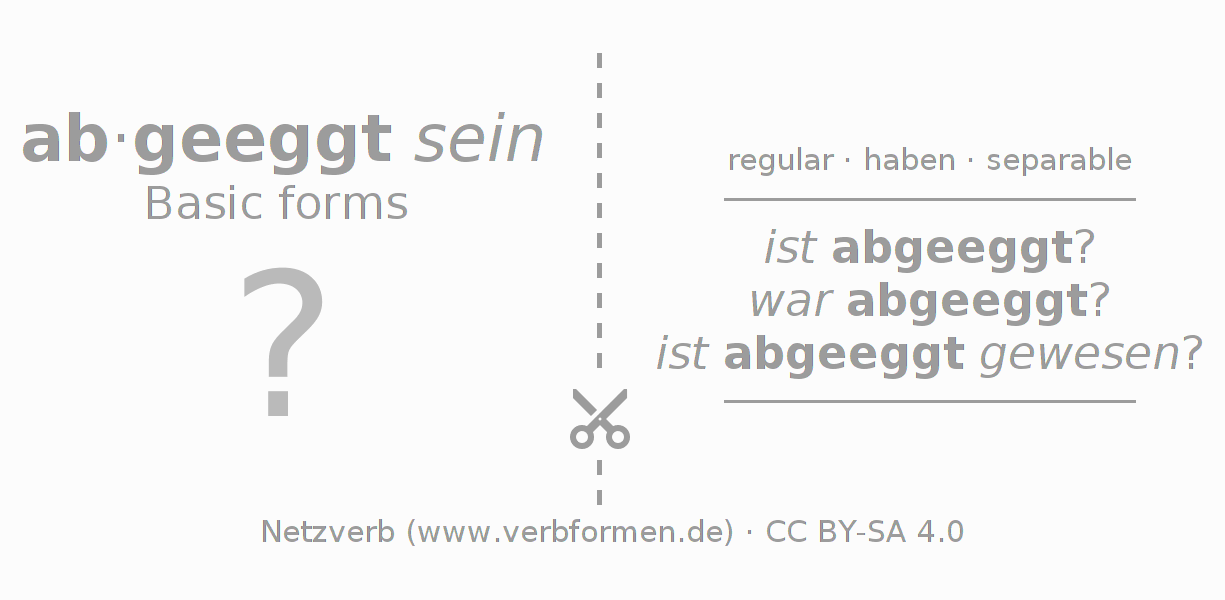 Worksheets are used generally for the conjugation of the verb abeggen in teaching. The materials can be used as Open Educational Resources (OER) for exercises, for games and as Tasks (CC BY-SA 4.0). There are many different types of tasks available for the verb abeggen. These are overview sheets with complete conjugation, puzzles and games that require joint learning. The entire educational material is available for free as a PDF download, as pictures and as an interactive browser version. In addition to the tasks, countless examples for abeggen also provide an aid to using the verb.