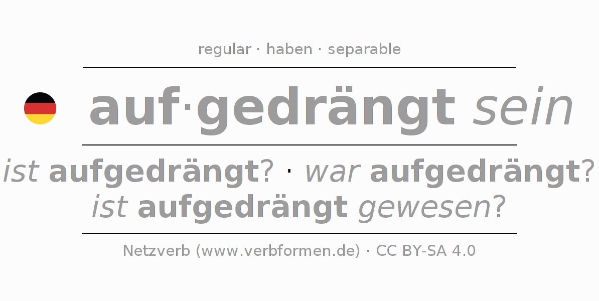 Worksheets are used generally for the conjugation of the verb aufdrängen in teaching. The materials can be used as Open Educational Resources (OER) for exercises, for games and as Tasks (CC BY-SA 4.0). There are many different types of tasks available for the verb aufdrängen. These are overview sheets with complete conjugation, puzzles and games that require joint learning. The entire educational material is available for free as a PDF download, as pictures and as an interactive browser version. In addition to the tasks, countless examples for aufdrängen also provide an aid to using the verb.