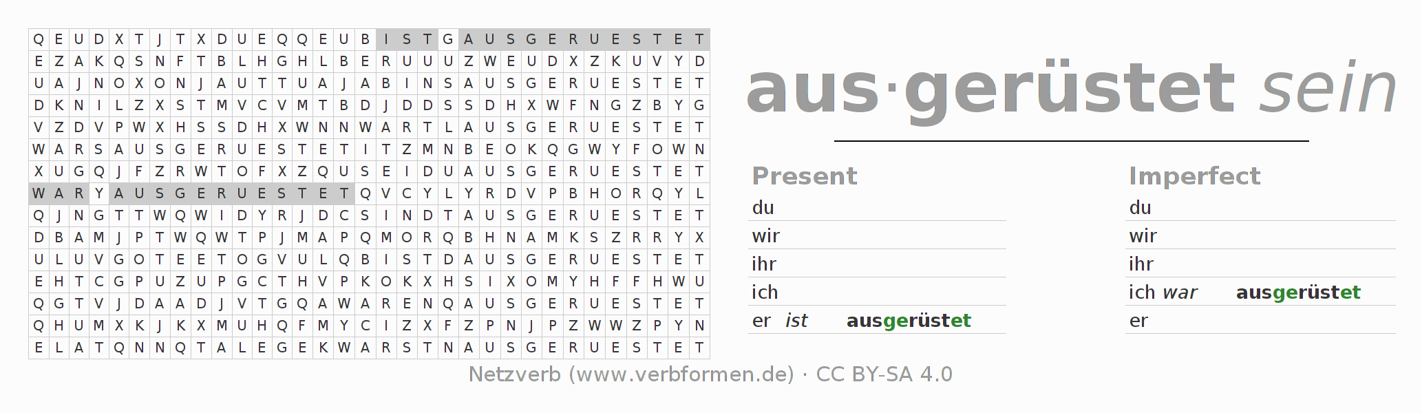 With these search word puzzles you can learn the conjugation of the German verb ausrüsten.