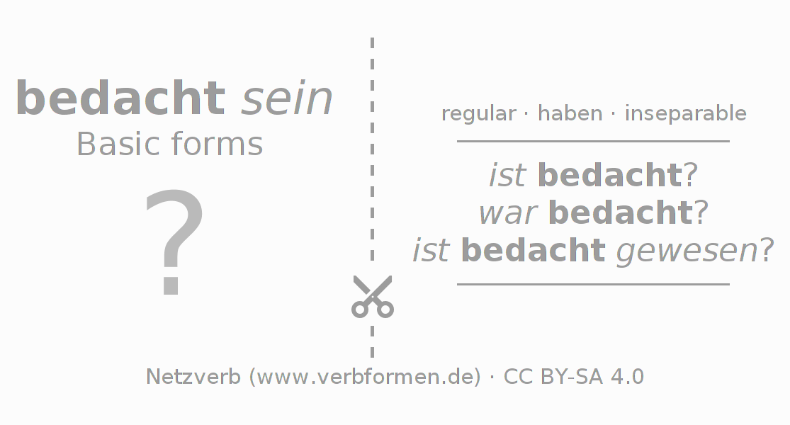 Worksheets are used generally for the conjugation of the verb bedachen in teaching. The materials can be used as Open Educational Resources (OER) for exercises, for games and as Tasks (CC BY-SA 4.0). There are many different types of tasks available for the verb bedachen. These are overview sheets with complete conjugation, puzzles and games that require joint learning. The entire educational material is available for free as a PDF download, as pictures and as an interactive browser version. In addition to the tasks, countless examples for bedachen also provide an aid to using the verb.