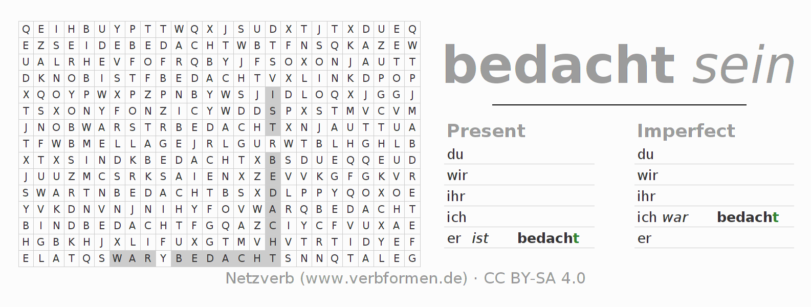 With these search word puzzles you can learn the conjugation of the German verb bedachen.