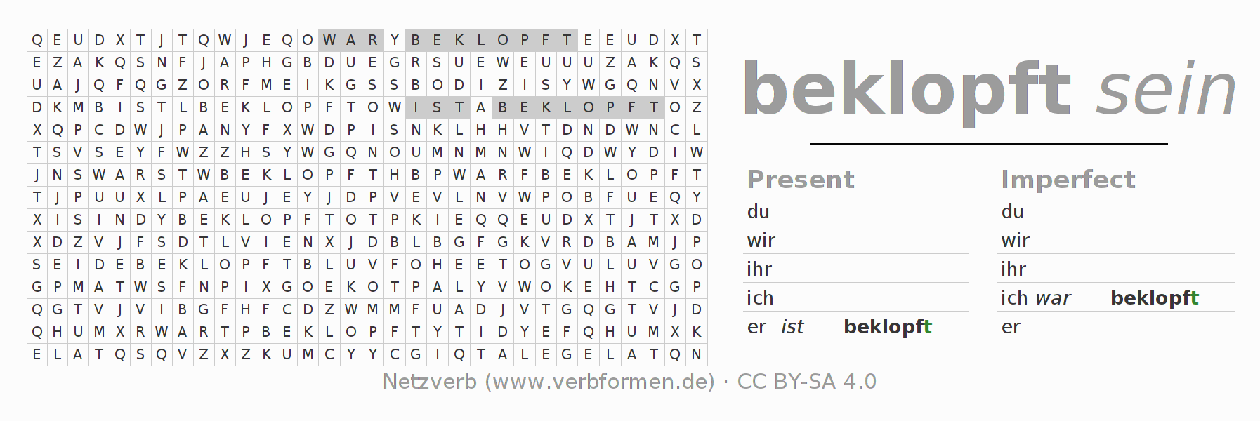 With these search word puzzles you can learn the conjugation of the German verb beklopfen.