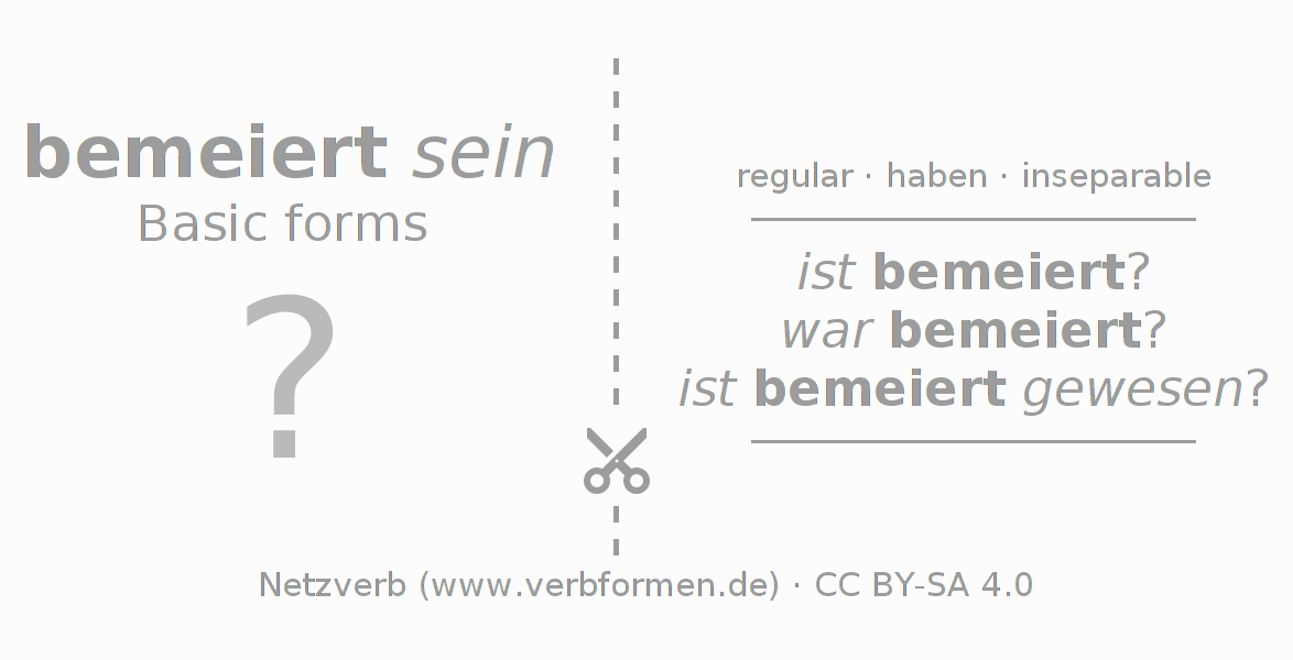 Worksheets are used generally for the conjugation of the verb bemeiern in teaching. The materials can be used as Open Educational Resources (OER) for exercises, for games and as Tasks (CC BY-SA 4.0). There are many different types of tasks available for the verb bemeiern. These are overview sheets with complete conjugation, puzzles and games that require joint learning. The entire educational material is available for free as a PDF download, as pictures and as an interactive browser version. In addition to the tasks, countless examples for bemeiern also provide an aid to using the verb.