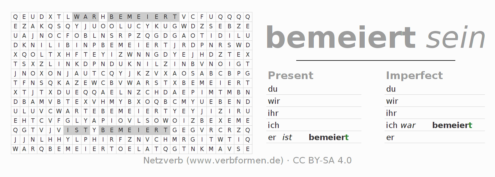 With these search word puzzles you can learn the conjugation of the German verb bemeiern.