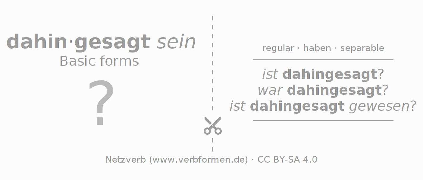 Worksheets are used generally for the conjugation of the verb dahinsagen in teaching. The materials can be used as Open Educational Resources (OER) for exercises, for games and as Tasks (CC BY-SA 4.0). There are many different types of tasks available for the verb dahinsagen. These are overview sheets with complete conjugation, puzzles and games that require joint learning. The entire educational material is available for free as a PDF download, as pictures and as an interactive browser version. In addition to the tasks, countless examples for dahinsagen also provide an aid to using the verb.