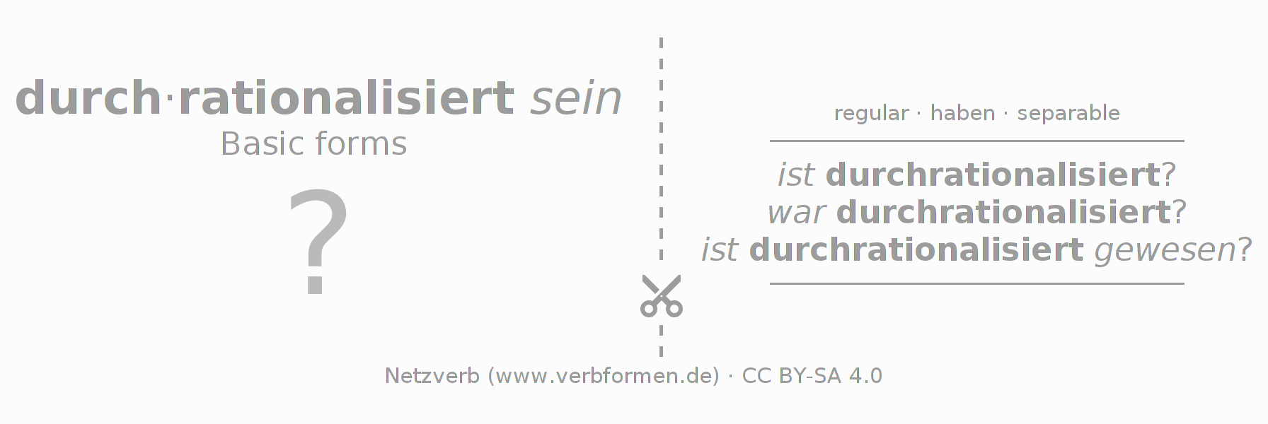 Worksheets are used generally for the conjugation of the verb durchrationalisieren in teaching. The materials can be used as Open Educational Resources (OER) for exercises, for games and as Tasks (CC BY-SA 4.0). There are many different types of tasks available for the verb durchrationalisieren. These are overview sheets with complete conjugation, puzzles and games that require joint learning. The entire educational material is available for free as a PDF download, as pictures and as an interactive browser version. In addition to the tasks, countless examples for durchrationalisieren also provide an aid to using the verb.