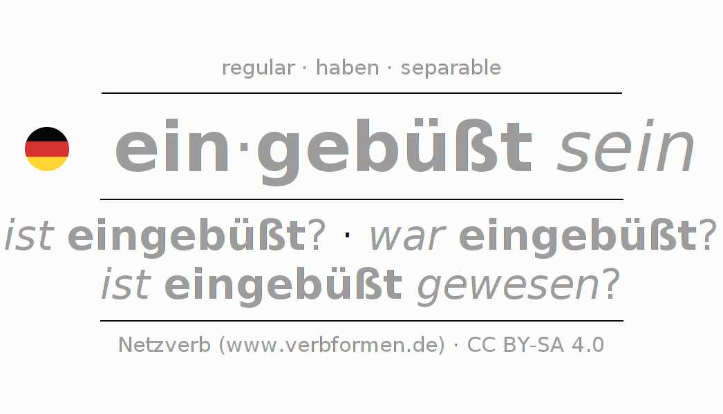Worksheets are used generally for the conjugation of the verb einbüßen in teaching. The materials can be used as Open Educational Resources (OER) for exercises, for games and as Tasks (CC BY-SA 4.0). There are many different types of tasks available for the verb einbüßen. These are overview sheets with complete conjugation, puzzles and games that require joint learning. The entire educational material is available for free as a PDF download, as pictures and as an interactive browser version. In addition to the tasks, countless examples for einbüßen also provide an aid to using the verb.