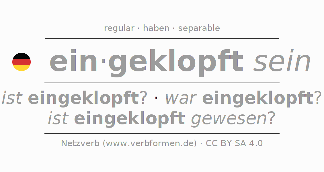 Worksheets are used generally for the conjugation of the verb einklopfen in teaching. The materials can be used as Open Educational Resources (OER) for exercises, for games and as Tasks (CC BY-SA 4.0). There are many different types of tasks available for the verb einklopfen. These are overview sheets with complete conjugation, puzzles and games that require joint learning. The entire educational material is available for free as a PDF download, as pictures and as an interactive browser version. In addition to the tasks, countless examples for einklopfen also provide an aid to using the verb.