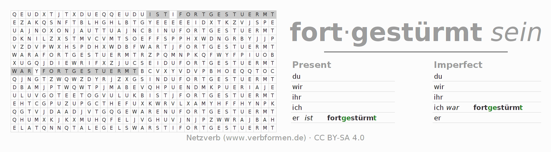 With these search word puzzles you can learn the conjugation of the German verb fortstürmen.