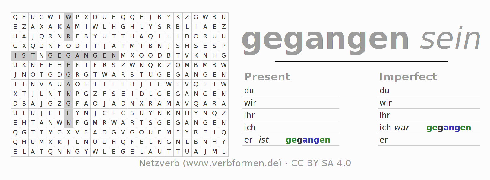 With these search word puzzles you can learn the conjugation of the German verb gehen.