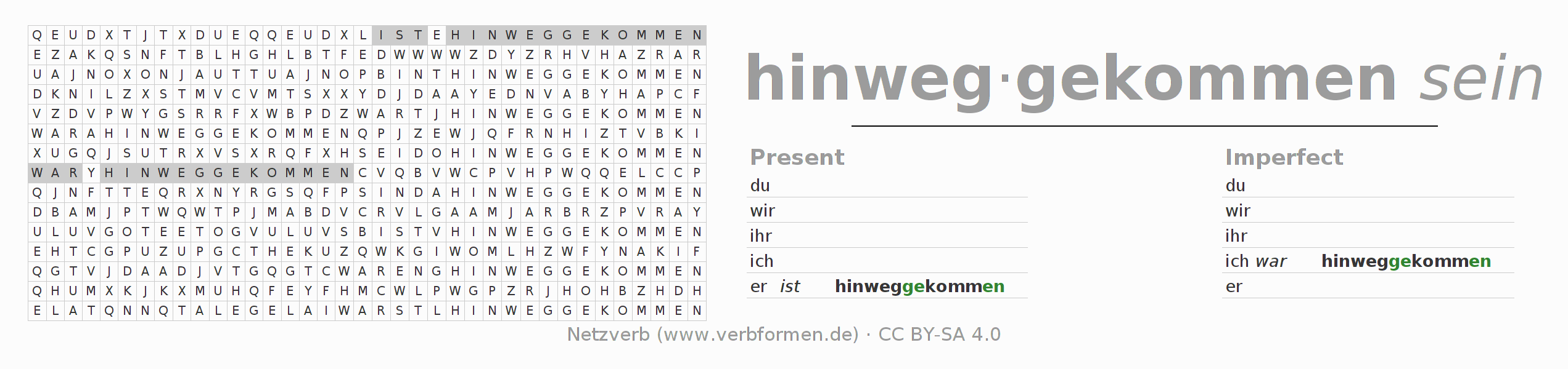 With these search word puzzles you can learn the conjugation of the German verb hinwegkommen.