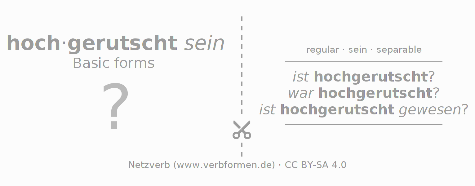 Worksheets are used generally for the conjugation of the verb hochrutschen in teaching. The materials can be used as Open Educational Resources (OER) for exercises, for games and as Tasks (CC BY-SA 4.0). There are many different types of tasks available for the verb hochrutschen. These are overview sheets with complete conjugation, puzzles and games that require joint learning. The entire educational material is available for free as a PDF download, as pictures and as an interactive browser version. In addition to the tasks, countless examples for hochrutschen also provide an aid to using the verb.
