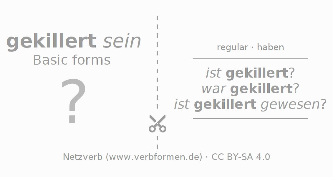 Worksheets are used generally for the conjugation of the verb killern in teaching. The materials can be used as Open Educational Resources (OER) for exercises, for games and as Tasks (CC BY-SA 4.0). There are many different types of tasks available for the verb killern. These are overview sheets with complete conjugation, puzzles and games that require joint learning. The entire educational material is available for free as a PDF download, as pictures and as an interactive browser version. In addition to the tasks, countless examples for killern also provide an aid to using the verb.