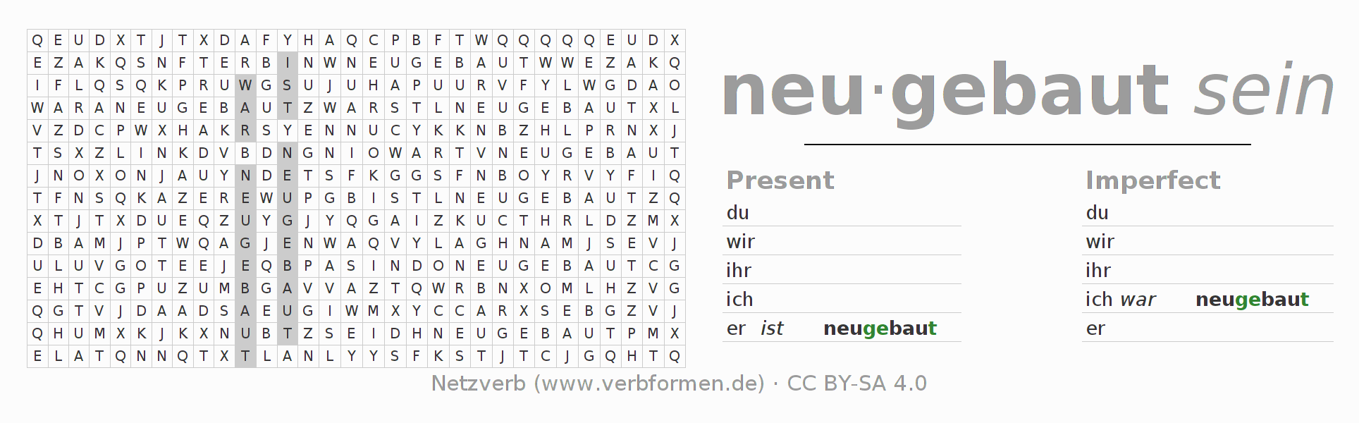 With these search word puzzles you can learn the conjugation of the German verb neubauen.